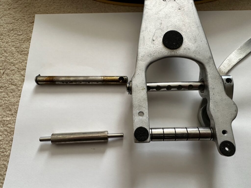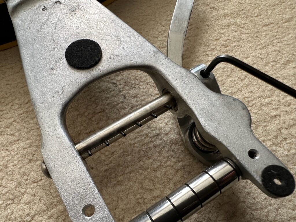 3. いもねじを外すとテンションバーの中のシャフトが抜ける。シャフトを抜くとテンションバーをビグスビー本体から分離できる。