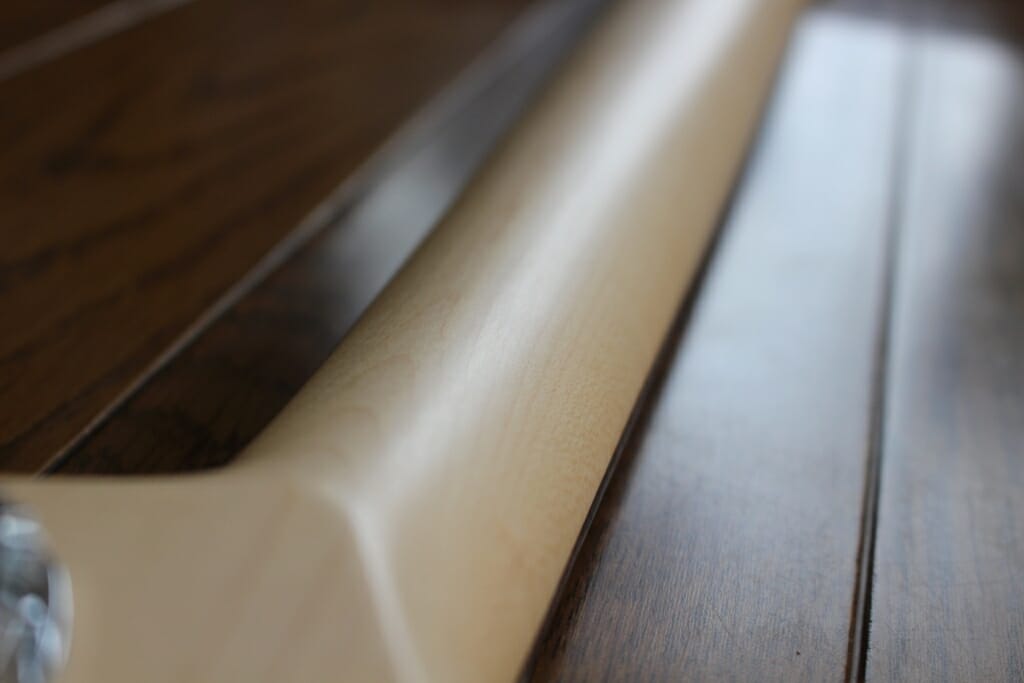 サテン仕上げの細身のスリムCネック、裏通し可能なブリッジ構造、そしてスパゲティーロゴ(スパロゴ)。