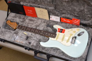 こちらの限定モデルはネックにローステッド加工を施したメイプル材を使用しております。ペグにはアメリカン・ウルトラ・シリーズでも採用されているロック式ペグを搭載。ピックアップにはカスタムショップ製69ストラトピックアップを搭載。カラーも通常のアメリカン・プロフェッショナル・ストラトキャスターにはないソニッ・ブルー・カラー。ピックガードは3プライのパーチメントを採用。