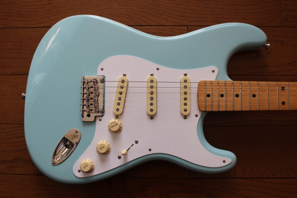 ストラトって色のバリエーションが豊富。1年ほどから僕が惹きつけられていたのは「ダフネ・ブルー」というプレーンな水色。レギュラーラインナップで水色系というと普通は「ソニックブルー」。ダフネはこれよりも若干色が濃い。このボディーにメイプルネックの組合わせがとてもいい。エリック・クラプトンがこのカラーのギターを使っていたことがあるらしいってのは後から知った。クラプトンっていうとブラッキーとかメルセデスブルーとかのイメージが強いから意外だった。