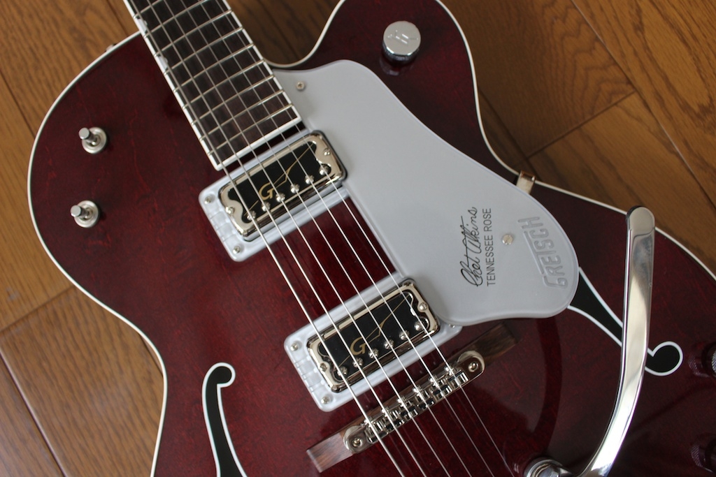 1962年仕様のグレッチ・チェット・アトキンスモデル・テネシアンTennesseanを復刻したテネシーローズTennessee Rose。ジョージ・ハリスンGeorge Harrisonはもちろん、浅井健一氏、チバユウスケ氏らに愛用されてきたこともあり絶大な人気を誇っております。