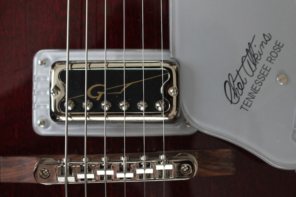 UNIQUE FEATURES Neo Classic ”Thumbnail” Inlay Position Markers, Zero Fret, Black Headstock Overlay, Bound Fingerboard and Headstock, Multiple Body Bindings, Simulated F-Holes, Silver Plexi Pickguard with Embossed ”Chet Atkins” Signature, Knurled Strap Retainer Knobs, Adjustable Truss Rod