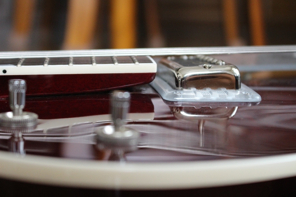 ところが最近、本体からブリッジの台座に向かって位置決めのピンが立っていて更にブリッジそのものもバー形状から通常のアジャスタブルに変更されているモデルが登場した。作っているのは日本の寺田楽器。楽器としての信頼度は上がった…というか、ようやく普通のギターになったというところか。とにかく致命的だと思われていた不具合が解消されている。