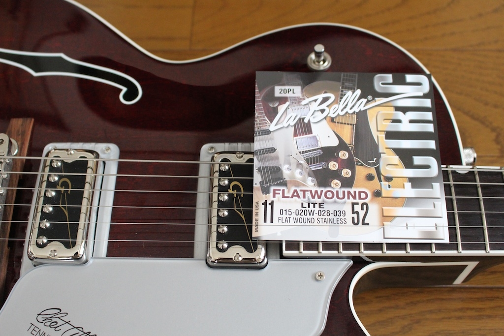 僕にとってはビートルズをやるためのギターなのでラベラのフラット弦も合わせて購入。持ち帰るやいなや早速張り替え。