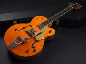 本モデルは、Vintage Orange Stainカラーのボディにニッケルパーツで統一されたクールなデザイン、そしてビグスビーとTV Jones製のフィルタートロンを搭載、そしてStyle Trestleブレーシングを採用し、1959年に生産された”6120 Chet Atkins”をリイシューしたモデルとなっております。メイプルボディに搭載されたTV Jones® Classicピックアップは、豊かなダイナミクスと明瞭なアーティキュレーションを備えた高品質なトーンを生み出します。内部の1959年スタイルのトレッスル・ブレイシングがトップとバックをつなぎ、バランスの取れた暖かいトーンを生み出します。さらに、”Squeezebox”ペーパーイン・オイルコンデンサーを採用することで、洗練されたヴィンテージトーンが楽しめ、より深みのあるサウンドを提供します。
