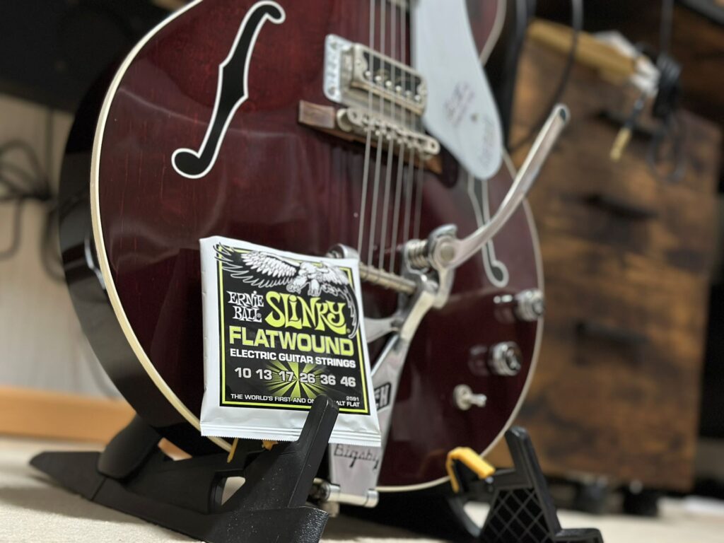 それにしても長いこと張り替えてないのでハードウェアの掃除がてら久しぶりに張り替え。家にアーニーボールのフラットワウンドのストックがあったのでそれを。No.2591。.10-.46のセット。これもしかしてRickenbacker 325用に買ったやつだっけ?まぁいいか。