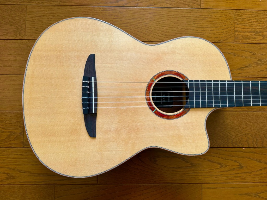 ピエゾタイプのピックアップが装着されていてアンプ通しが可能なこと以上に、弦高がかなり低い設定になっていて弾きやすいとのこと。クラシックギターは12フレットでも3.5から4mm近い高さなのが普通なのだが、エレガットだと3mmくらい。こんなに低くてビビったりしないんだろうか?サスティーンが伸びるんだろうか?